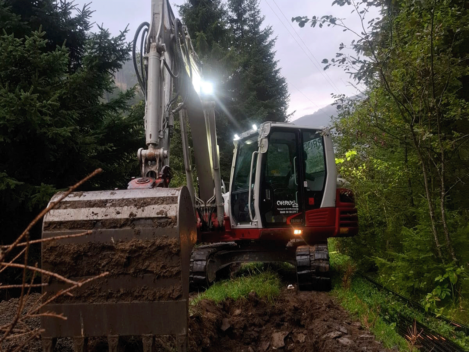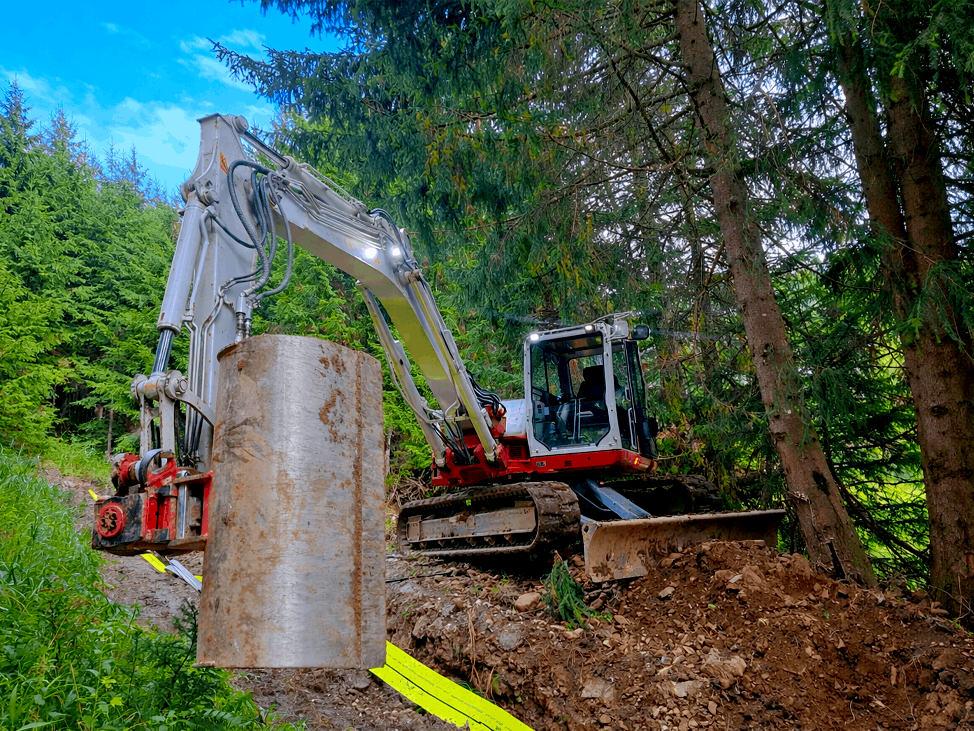 Aushub- und Erdbewegungsarbeiten unter anspruchsvollen Bedingungen im Wald- und Hangbereich.