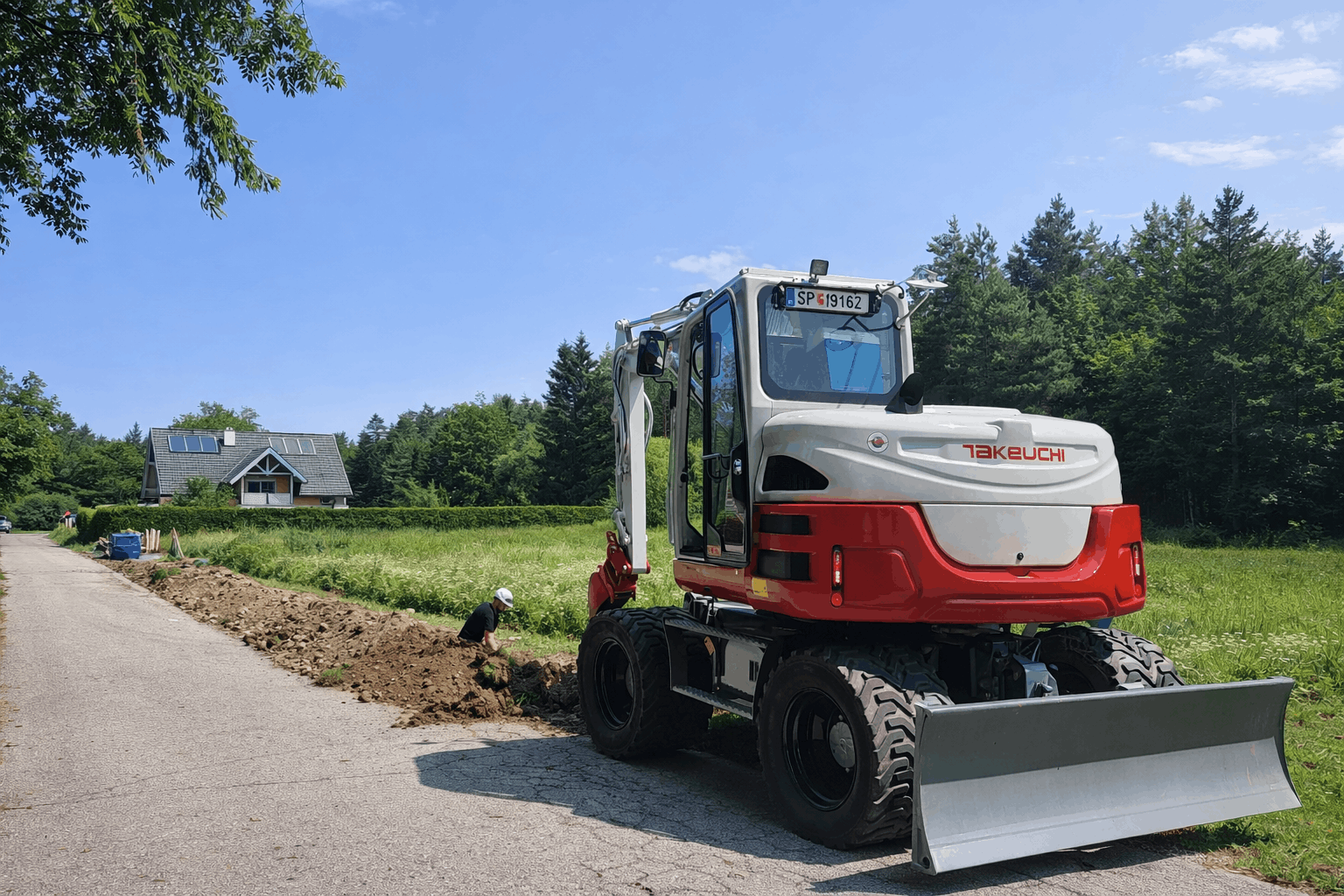 Präzise Künettengrabung entlang einer Zufahrtsstraße zur Vorbereitung von Kabel- und Leitungsarbeiten.