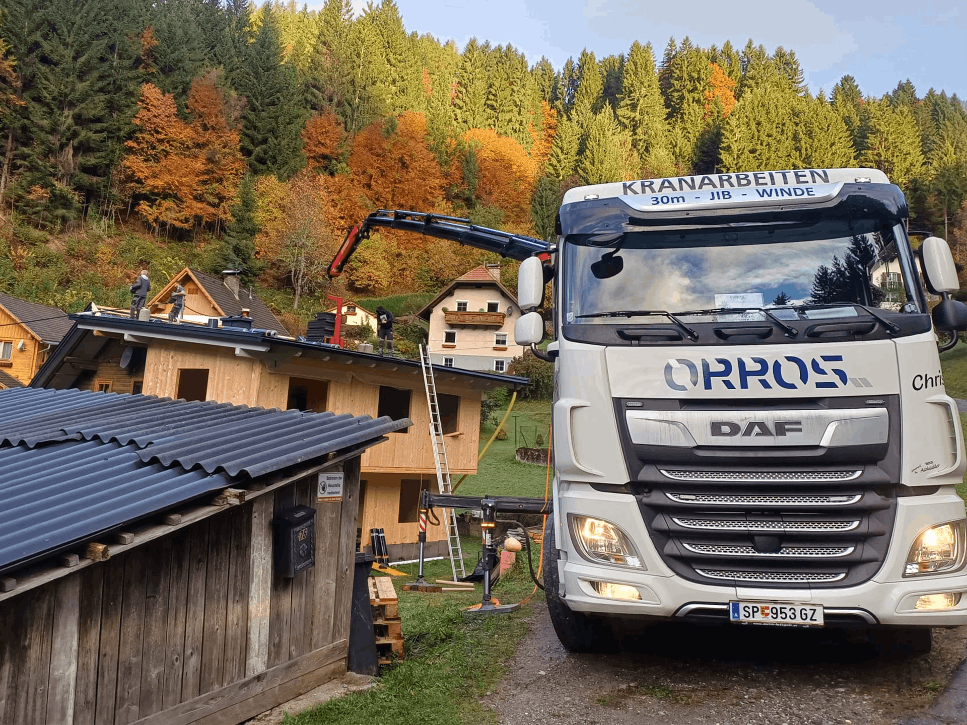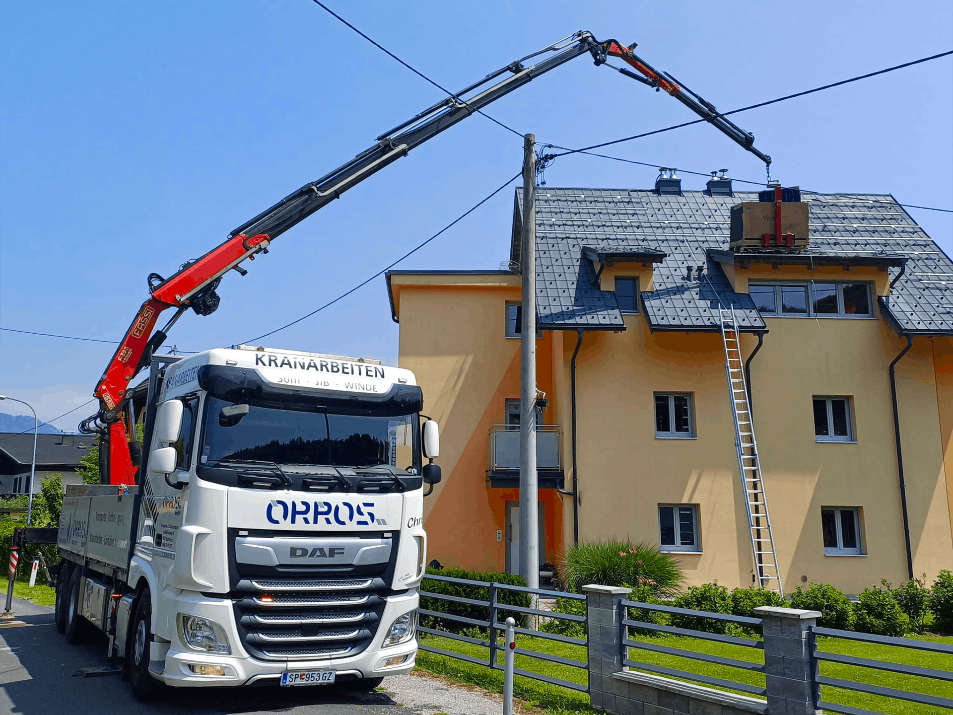 Anlieferung und sicherer Hub von Baumaterial direkt auf das Dach.