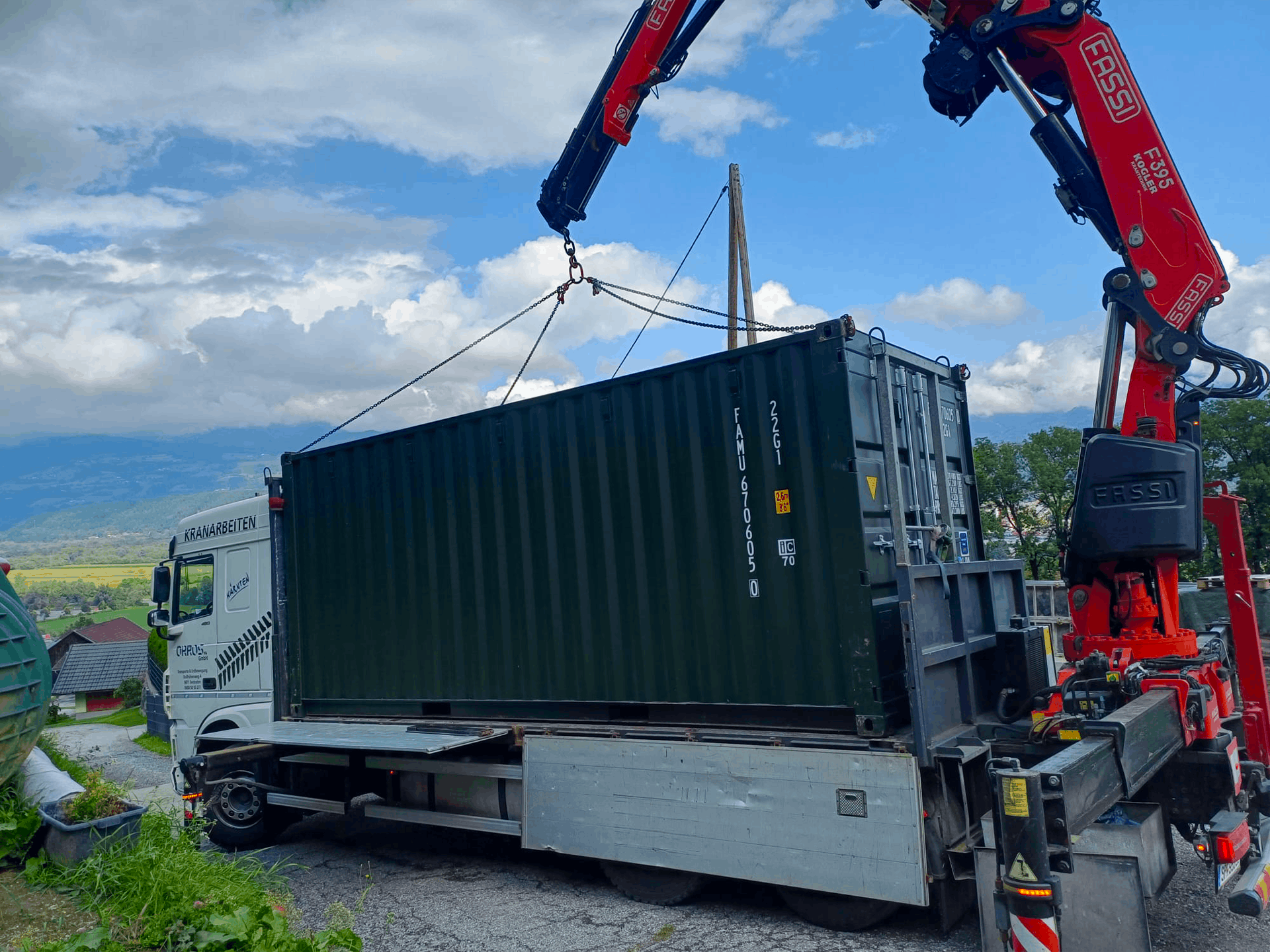 Transport und präzises Versetzen eines Containers mittels Ladekran – effizient auch auf engem Gelände.